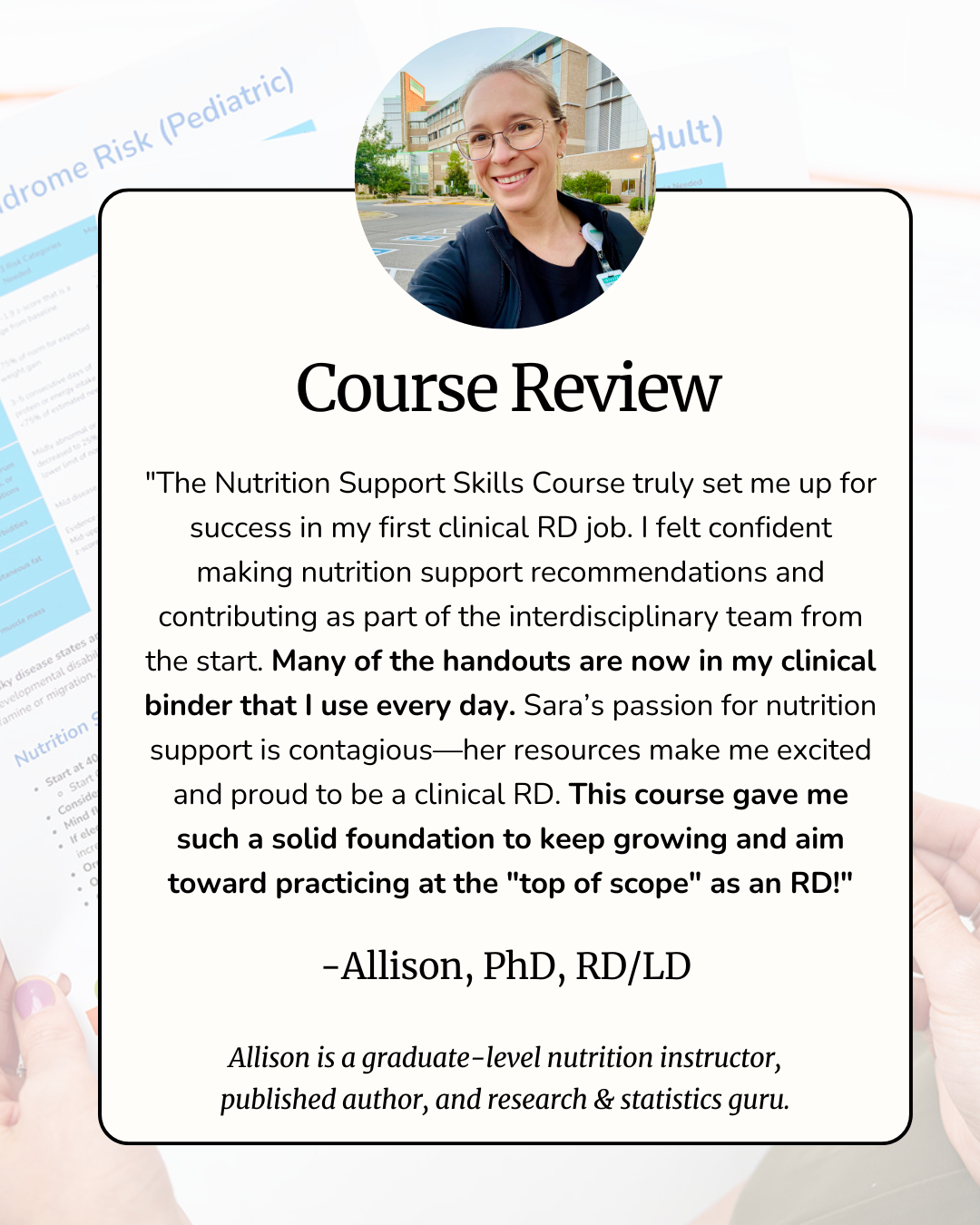 Nutrition science changes all the time! Don't rely on old, outdated nutrition support content. I still work regularly in the hospital and ICU, and incorporate up-to-date guidelines and the latest nutrition science into my content.